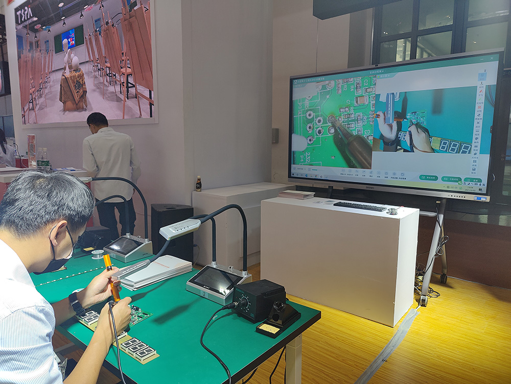 現場最吸睛的莫過于是實訓5G無線全錄播系統展區了,來往的觀眾紛紛舉起了手機拍攝系統運行的過程,精心布置的展區現場直觀展示了全錄播系統與繪畫、烹飪、醫護、電子雕刻等不同職教場景的高度融合。