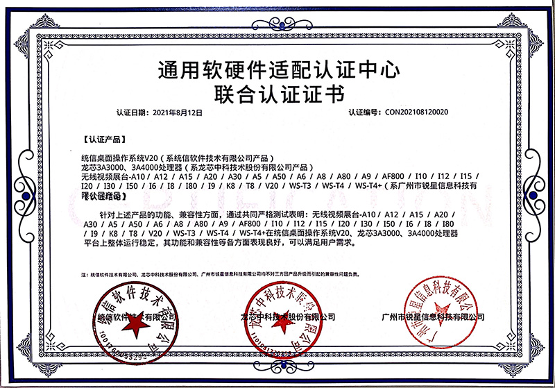 測試結果表明無線展臺系列產品滿足兼容認證要求,可穩定高效運行于UOS操作系統中,兩者穩定運行于龍芯、兆芯、海光的國產CPU平臺,兼容性良好、穩定運行、性能卓越,能夠滿足用戶多樣化需求。