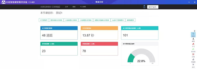 吉星強交互智慧課堂結合大數(shù)據(jù)分析,自動收集學生課堂測驗的數(shù)據(jù),并形成一系列不同方面數(shù)據(jù)報表,幫助教師分析全體學生的學習情況,針對各學生的薄弱情況進行重點教學。